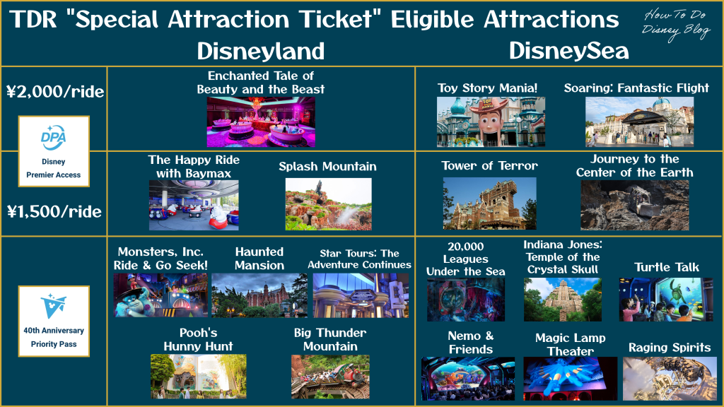 You’re probably asking, “What Attractions are eligible with the Special Attraction Ticket?”, and the answer is, “everything with a skip-the-line queue”: