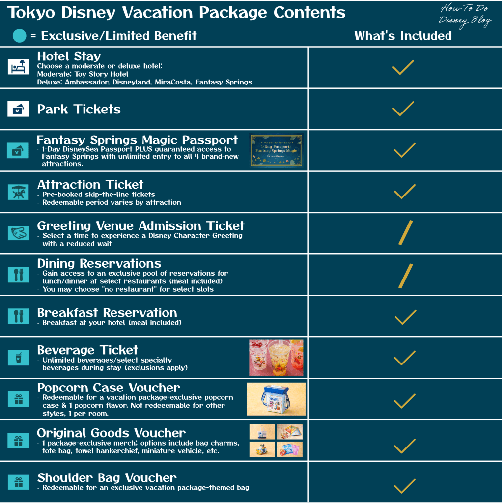 Well, that would be Vacation Packages: a nearly all-inclusive offering that includes a hotel stay, park tickets, breakfast, pre-booked priority access to attractions, drink vouchers, and exclusive merchandise, among other things. Depending on the type of vacation package you select, you may also gain access to an exclusive pool of dining reservations for select restaurants and priority access to meet-and-greets. This graphic neatly summarizes the benefits: