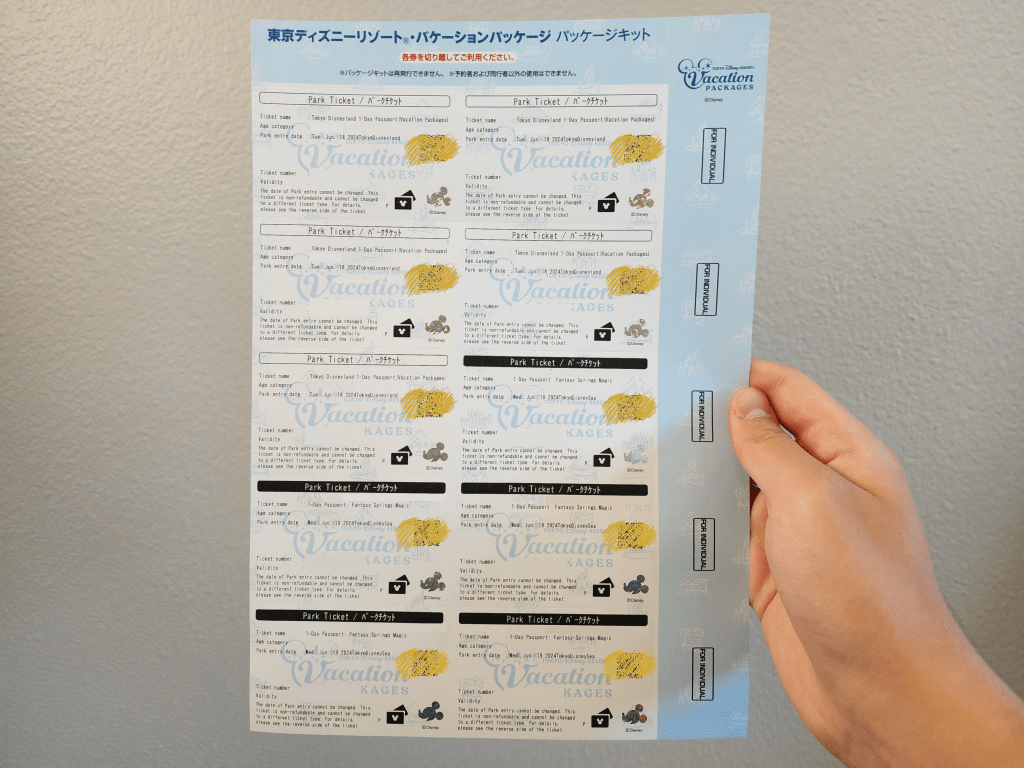 A park ticket will be given for each day of your vacation package. You are not allowed to choose which park you go to on which day. Depending on which Vacation Package you select, you may be eligible for specialty tickets. Currently, all Vacation Packages include a Fantasy Springs Magic Passport, which functions as both a 1-Day DisneySea Passport AND grants you unlimited access to the new Fantasy Springs land and its attractions in Tokyo DisneySea.