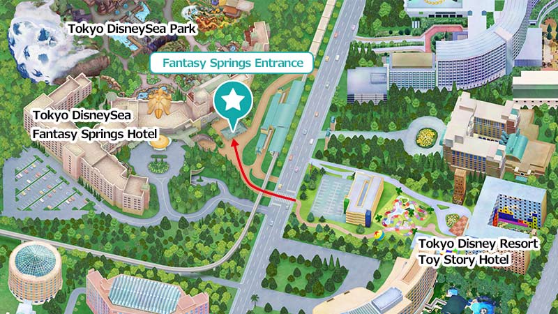 Currently, access to the Fantasy Springs Entrance is limited to guests of the Tokyo DisneySea Fantasy Springs Hotel, meaning guests of the Toy Story Hotel right across the street have to go to the main entrance, which takes about 15 minutes.